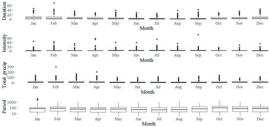 Box and whisker plots for each of the storm properties annual variation showing duration (row 1), intensity (row 2), total precipitation (row 3), and inter-storm period (row 4) values using a one-month bin.