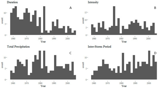 Evolution of the distribution for all storm properties was then evaluated to show when the extremes of precipitation occurred in the area (Figure 3). Many of the duration extremes occurred in the start of the study period and their occurrence rate slowly declined with time. Inter-storm period had the opposite behavior with many of the extreme values coming in the most recent portion of the study period. Total precipitation and intensity had less obvious changes in the occurrence of their extremes. Extreme events of intensity became more frequent over the study period, with the plot of intensity extremes occurrence vs. time increasing slightly with time (Figure 3).