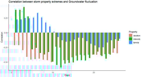 Figure 4 shows the correlation between the extreme values of precipitation characteristics (duration, intensity, and total precipitation), which are taken as the 95th percentile of each unique property compared to the fluctuation of groundwater head. Since groundwater fluctuation was measured using depth to groundwater surface, a decrease in depth to water corresponded to an increase in water storage in the aquifer since the water table was closer to the surface. The strongest correlation of all the studied storm properties was with intensity, with a maximum correlation coefficient of −0.6 at 12 days after the end of a rainfall event. Duration shows a relatively weaker correlation, but it is more consistent with peaks at −0.5 at 10 days. Total precipitation was weakly correlated to increased groundwater storage, peaking much after the other two storm properties mentioned above, at −0.25 at 21 days.