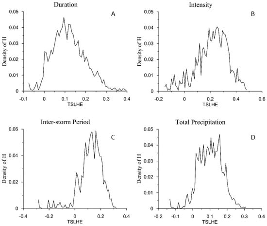 Probability density functions (PDF) of the time-scale local Hurst exponent (TSLHE) calculated for each of the storm properties using the full data sets with duration (A), intensity (B), inter-storm period (C), and total precipitation (D).