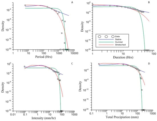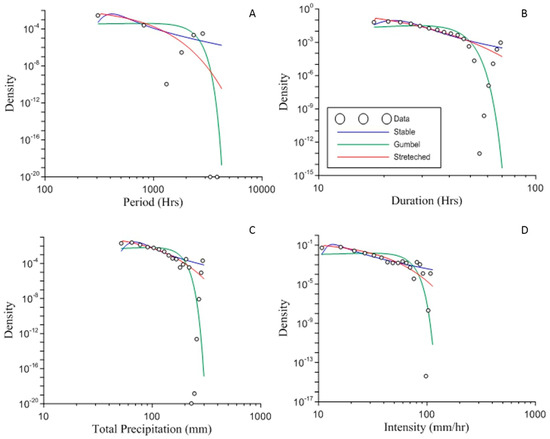 The best-fit PDF distribution for the full data set of each storm property: Inter-storm periods (A), duration (B), intensity (C), and total precipitation (D) using the three proposed distributions: Stable (the blue line), Gumbel (green line), and stretched Gaussian (red line) compared to the actual data (open circles).