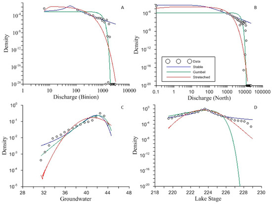 PDF distribution fittings for measurements of: Binion Creek discharge (A), North Creek discharge (B), depth to groundwater (C), and lake stage (D) using each of the proposed distributions: Stable (blue), Gumbel (green), and stretched Gaussian (red) compared to the actual data (white circles w/black outline).