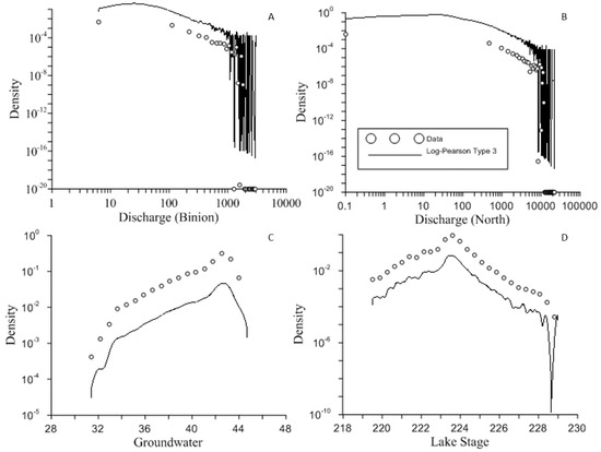 PDF distribution fittings for measurements of: Binion Creek discharge (A), North Creek discharge (B), depth to groundwater (C), and lake stage (D) using only the Log-Pearson Type 3 distribution (black lines) compared to the actual data (white circles w/black outline).
