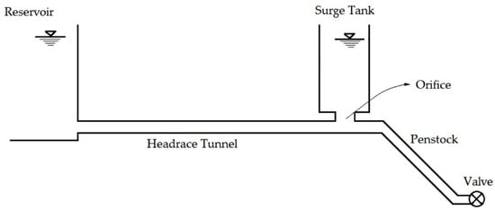 In this study, a generalized system of a high-head hydropower station is selected for analysis during extreme cases of hydraulic transients. The system consists of a constant-head upstream reservoir, headrace tunnel, orifice surge tank, penstock pipe, and turbine at the end of the penstock. Because this study mainly focuses on the surge analysis and hydraulic optimization of the surge tank, the downstream turbine can be simplified into a valve boundary, as shown in Figure 1. First, 1-D numerical modeling and analysis of the hydraulic transients, occurring due to valve operation of the system, is carried out by using MOC. Gradual closing of the valve during the maximum water level in the reservoir and gradual opening of the valve during the minimum water level in the reservoir are considered as the two worst cases, which give the maximum and minimum water level in the surge tank, respectively. Secondly, major hydraulic transient behaviors in the system are studied and analyzed.