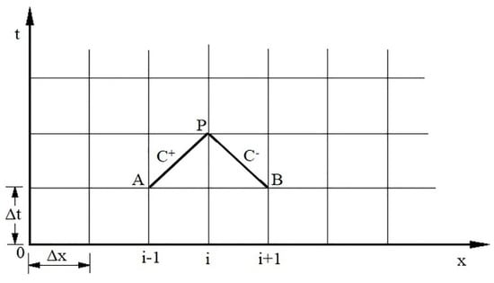As shown in Figure 2, the characteristic lines C+ and C− intersect at point P. Thus, with the known initial values during a steady state condition, Equations (3)–(8) give the values of head and discharge at a particular time and position in the x-t grid.