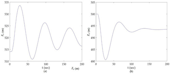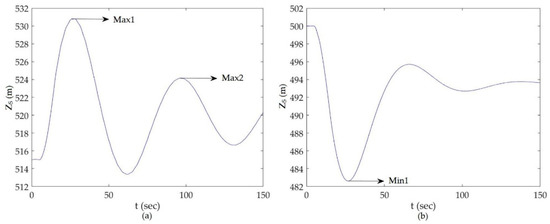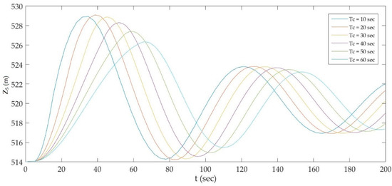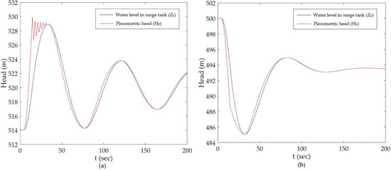 Figure 7 depicts the most important characteristics of the hydraulic transient in the hydropower system due to valve maneuver, which plays a vital role in surge tank design. Figure 7a shows the water level in the surge tank, during the maximum water level in the reservoir and full load rejection condition. Hence, the maximum value of surge head shown by the graph indicates the maximum possible surge head reached for the given condition of valve closure. Initially, the water level is constant for 5 s, which represents the steady state condition. After the start of valve closure at 5 s, the water level gradually rises to its maximum value and starts oscillating to consecutive maximum and minimum values due to water hammer action. Damping of surge waves in this condition occurs gradually and its value, as given by Equation (23), is calculated to be 1.378%. Similarly, Figure 7b shows the water level in the surge tank during the minimum water level in the reservoir and full load acceptance condition and hence it reveals the minimum possible water level for the given time of valve opening. The initial horizontal line represents the steady state for 5 s, valve opening is started at 5 s, and the water level drops to its lowest value and then starts oscillating. Discharge is kept constant, regardless of the water level in the reservoir. Damping of surge waves during the valve opening condition occurs very fast, while during valve closing, surge waves dampen gradually and hence, damping of surge waves during the valve closing condition should be properly analyzed. The theoretical value of the time period of surge waves, given by Equation (15), is calculated to be 69.524 s, and from this analysis, this value is found to be 69.888 s. This shows that the modeling and analysis results are fairly accurate.