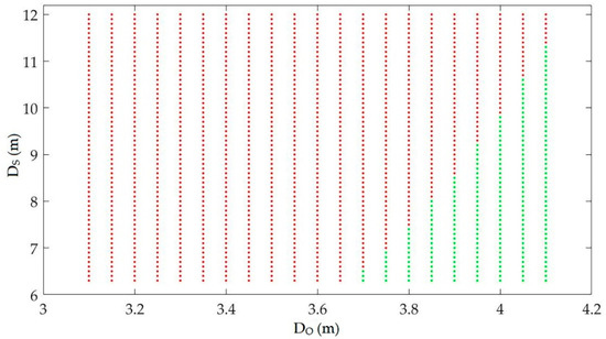 The constraints described in Section 2.7 define the total population for optimization and also distinguish valid and invalid regions based on the difference of the maximum piezometric head at the bottom tunnel of the surge tank and the maximum water level in the surge tank. Figure 5 shows various values of DO and DS within the range of optimization discussed earlier. The green area in the graph shows the valid region, where the value of the difference of the maximum heads is less than 1 m, and the red area in the graph shows the invalid region, having the difference of the maximum heads of more than 1 m. This eventually makes the optimization problem highly non-linear and discontinuous and the individual objective functions are highly conflicting in nature.