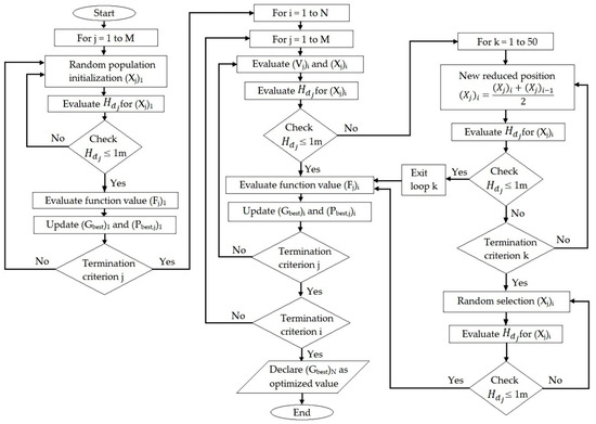 Figure 6 shows the flowchart for PSO used for the optimization of the hydraulic characteristics of the generalized hydropower system. In this study, when the difference of the maximum head at the bottom tunnel at the point of the surge tank and the maximum water level in the surge tank is less than or equal to 1 m ( ≤ 1 m), the solution and corresponding DO and DS are considered acceptable, while, when is more than 1 m, they are considered unacceptable. If this head difference is smaller, it ensures efficient working of the surge tank [47]. During optimization, to avoid the solutions of the unacceptable region, a technique of reducing the position is applied, as shown in Figure 6. Whenever the new position of any particle is calculated using Equation (28), if the new position falls into the unacceptable region, then the average of the previous position and current position is taken as the new position, and again, the region of the new position is checked. Every time, the velocity of the new position is reduced by half until it falls into the acceptance region. If the new position does not lie in the acceptance region for 50 iterations, a random new position is assumed within the range of the variables. This reduction in new positions reduces the speed of acquiring the global minimum or maximum, but more importantly, it enables the program to stay in the acceptable region during all calculations.