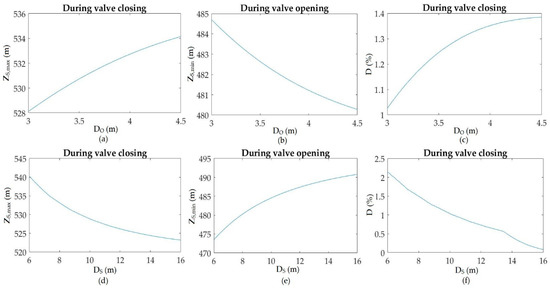 Maximum water level (a,d); minimum water level (b,e); and percentage of damping (c,f) for different diameters of orifice (Do) and diameters of surge tank (Ds).