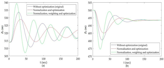 After performing PSO for the given system, the optimized values of DO and DS were obtained to be 4.1 m and 11.362 m, respectively. These optimized dimensions of the surge tank produced significant improvements in the maximum and minimum water level in the surge tank, while the damping of surge waves was not improved, as shown in Table 2. In order to improve the damping of surge waves, a weighting factor of 0.25, 0.25, and 0.5 was multiplied in each objective function, respectively, and optimization was performed again. The optimized values were obtained as Do = 3.684 m and Ds = 6.434 m and better damping of surge waves was obtained, while the values of the maximum and minimum water level in the surge tank were worse than the original case. For these two optimization cases and the original case, surge analysis is carried out and the results are presented in Figure 10. The values of each objective function for all three cases are tabulated in Table 2 and improvements obtained are analyzed.