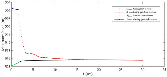 The closure and opening time of the valve can have significant effects on the transients occurring in the system [23,24,25,28]. Generally, in hydropower projects, gradual closure and opening of valve is adapted for adjusting the condition of flow in the system and power demands. In this study, all the analysis is conducted with linear closing and opening of the valve in 10 s. Figure 12 and Figure 13 show the sensitivity analysis for valve closing/opening time in linear progression for the optimized values of DO and DS. The valve closing/opening time is changed from 10 s to 60 s at an interval of 10 s. For time of closure from 10 s to 30 s, the maximum water level is almost the same and it gradually decreases for a further increase in closing time, as shown in Figure 12. Similarly, for the valve opening case, the minimum water level gradually increases with an increase in valve opening time, as shown in Figure 13. Hence, as valve maneuver time increases, the maximum water level decreases and the minimum water level increases, and thus the effects of transients are slightly reduced. Generally, the effect of changing gradual closing/opening time of the valve has negligible effect in surge analysis [15], but in this case, the effect is significant. Hence, valve or guide vanes’ closing/opening time is also an important parameter for the hydraulic optimization of the surge tank for this study and should be considered in future optimization cases. An elaborate study on the effects of changing closure time for maximum piezometric head at the bottom tunnel of the surge tank and maximum water level in the surge tank is performed, as shown in Figure 14. The pipe characteristic time for this case is 1.667 s and closing of the valve below this time indicates fast closure of the valve. The maximum pressure head at the bottom tunnel of the surge tank is very high for fast closure and it quickly decreases as soon as gradual closure occurs and gradually becomes almost constant after the valve closing time reaches 15 s. Contrary to that, the maximum water level in the surge tank during fast closure is lower and it increases linearly till 2.5 s of valve closing time, and afterwards, the changes in the maximum water level in the surge tank are very small. The difference of these two pressure heads for a closing time of more than 10 s is less than 1 m, which indicates effective functioning of the surge tank. The effects of fast closing of the valve are more significant in tunnel pressure changes, while for the surge tank, they are comparatively less significant.