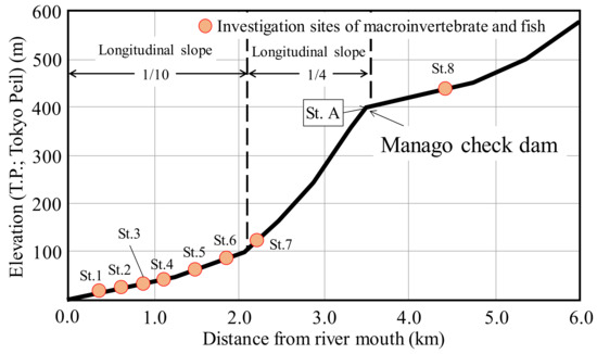 To evaluate the effects of sediment supplied from the check dam, we captured benthic invertebrates from the Kamo River. We installed eight investigation stations including a reference site located upstream of the check dam (Figure 1 and Figure 2). We selected a 50 m reach and captured invertebrate species in rapids, runs and pools each investigation site. We collected invertebrates over 30 min working with four people using surber nets so that the sampling was consistent across surveys (net length 0.51 m, mesh size 0.3 mm). The sampled invertebrates were preserved in 80% ethanol in the field and were identified later by Plantbio Co., Ltd. Macroinvertebrates were sampled in seven seasons during two years.
