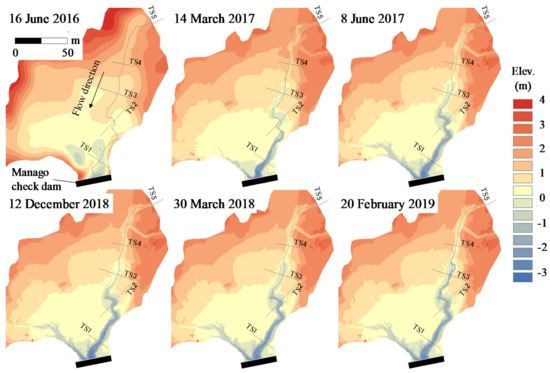 As revealed by SfM analysis of the aerial photographs collected by UAV, the largest topographic change occurred immediately after the beginning of the sediment supply and was concentrated around the vicinity of the drain outlet (Figure 3). After several floods, the ground level mainly declined around the water course. On 8 June 2017, ground level degradation reached cross section 2. After the flood season, no significant change in the topography occurred in autumn or winter. Ground level degradation progressed again during flood season of the second year, and degradation reached cross section 3. Further, the water course had meandered near cross section 3, suggesting a large topographic change.