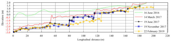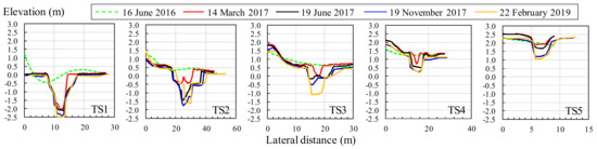 In addition, the longitudinal formation of the water course declined significantly immediately after the drain outlet was opened (Figure 4). Further, the longitudinal profile was characterized by sudden change of the gradient accompanied by steps due to the resistance from rootstock. The riverbed elevation had degraded by the discharge of deposits in the upper reach of the steps since the steps collapsed during the flood. The topographic change in the longitudinal direction indicated that degradation near the drain outlet immediately after it was opened spread to the upper reach, which restricted erosion from downstream. Since the ground elevation did not change significantly except for around the water course from June 2017 to February 2019 (Figure 3), most of the sediment discharge was likely accompanied by riverbed degradation. On the other hand, the cross-section profile of TS 1, located furthest downstream, was degraded and had widened immediately after the drain outlet was opened. However, no significant change was observed after 4 March 2017. At TS 2 to 4, the cross-section profile changed with repeated degradation and widening. In contrast, no large widening occurred and the tendency of erosion prominence was confirmed at TS 5, located at the most-upstream part of the river (Figure 5).