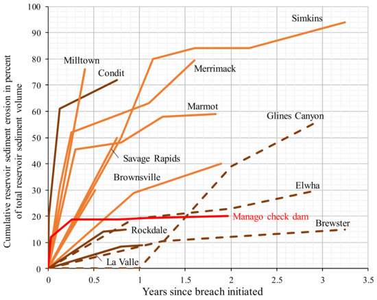 Percentage of reservoir sediment eroded with time after dam removal. Comparison between the Manago check dam and other sites of dam removal. Modified from Major et al., 2017 [10]; Sawaske and Freyberg, 2012 [8]; Grant and Lewis 2015 [9]; Foley et al., 2017 [48].