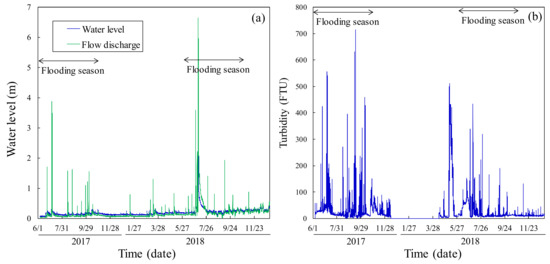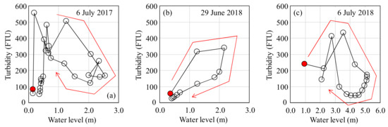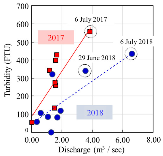 The relationship between flow discharge and turbidity in each year is indicated in Figure 8. The turbidity value for the same flow discharge was larger in 2017 than in 2018, when comparing the relationship between the peak values of turbidity and flow discharge. The largest flood observed during the monitoring period occurred in 2018, however, the value of turbidity did not increased much. In addition, a clockwise loop in the relationship between water level and turbidity was observed during the larger floods (Figure 9). During the large flood of 6 July 2017, the value of turbidity decreased suddenly as the water level increased. This trend was also observed during the flood of 6 July 2018. The structure of the drain outlet conducting the sediment supply seems to explain this trend. The drain outlet is 1 m over from the riverbed, so when the water level rises above the drain outlet, the attractive force decreased because of the backwater, leading to the sudden decrease in turbidity.