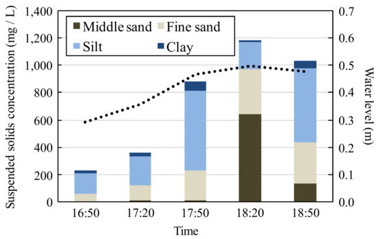 Next, we discuss the relationship between the suspended solid concentration and the particle size of transported sediment. Figure 10 shows the change in particle size and suspended solid concentration over time, during the flood of 24 June 2017. During the period of increasing flow discharge, most of the transported sediment was silt and the ratio tended to increase along with the increasing concentration of suspended solids. On the other hand, the proportion of sand increased during the stage of peak flow discharge when the suspended solid concentration exceeded 1000 mg/L. The ratio of silt increased again during the period of decreasing flow discharge.