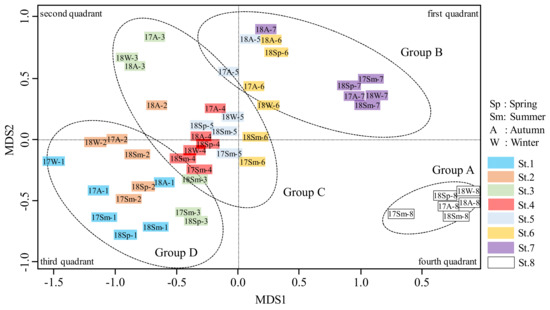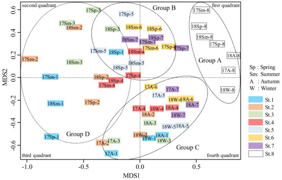We collected 48 (eight stations by six seasons) samples of fish fauna which were classified four groups and plotted using NMDS (Figure 13). Cluster analysis showed that the fish fauna of the Kamo River can be classified into four groups along the longitudinal direction. Fish collected at stations located upstream of the check dam that supplied sediment are classified into Group A, unlike those collected from other stations. On the other hand, Group B is composed of stations located upstream (6 and 7), Group C is composed of stations located midstream (3, 4 and 5), and Group D was downstream (1 and 2).
