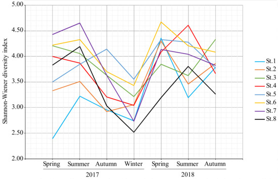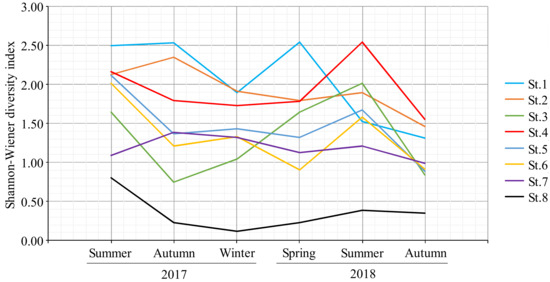 Time change of Shannon–Wiener diversity index of each stations in the Kamo River (macroinvertebrate community).