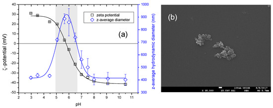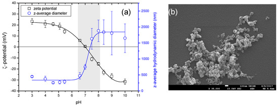 By further increasing the pH, the ζ potential decreases until the point of zero charge (PZC) at pHpzc = 5.8 ± 0.1. This value is close to the experimental value of pHpzc = 6.2 that was obtained by Loosli et al. [30]. When the pH is higher than pHpzc, the surface charge becomes negative and stable at −40 ± 2 mV at pH 10 ± 0.1. The z-average hydrodynamic diameter of TiO2 NPs is found stable below pH 5.0 with values that are equal to 430 ± 10 nm. Subsequently, fast aggregation is observed with a maximum value of 887 ± 40 nm in the PZC region. A further pH increase leads to the decrease of the TiO2 hydrodynamic diameter, indicating reversible aggregation. When pH ≥ 8.0, TiO2 NPs exhibit a stable domain with values of z-average hydrodynamic diameter equal to 405 ± 10 nm in good agreement with the SEM image of TiO2, as presented in Figure 1b. TiO2 NPs destabilization is observed in a ζ potential range between +20 and −25 mV, as indicated in the gray area (Figure 1a).