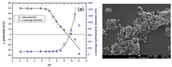 The surface charge and stability domain of polystyrene latex nanoplastics versus pH are illustrated in Figure 3a. PS nanoplastics are found to be strongly positively charged and stable at pH < 7.0 with values that are equal to +50 ± 1 mV. By increasing pH, surface charge of nanoplastics decrease to the PZC at pHpzc = 9.9 ± 0.1 as (Figure 3a), which is close to the value that was obtained by Cross et al. [32] with pHpzc = 9.5. Subsequently, charge reversal occurs by further increasing the pH. No aggregation is observed below pH 9.0 and nanoplastics remain stable with a z-average diameter that is equal to 98 ± 2 nm. Such a pH-surface charge behavior is related to the high pKa value of amidine functional group, which is approximately equal to 12 [33]. Aggregation is observed in the PZC region with a maximum z-average diameter value of 1260 ± 190 nm. SEM picture (Figure 3b) indicates that the PS nanoplastics are spherical and highly monodispersed.