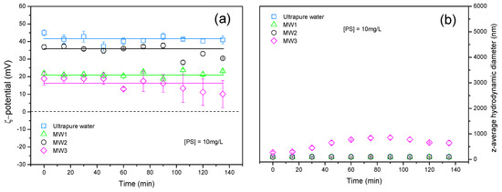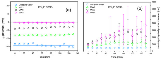 The stability of TiO2 NPs in bottled mineral waters as a function of time is first considered. The ζ potential and z-average hydrodynamic diameter of TiO2 NPs in MW1, MW2, and MW3 are presented for comparison in Figure 4a. In ultrapure water that was adjusted at the pH of the mineral waters i.e., pH 7.0 ± 0.1, ζ potential and z-average hydrodynamic diameters are found to be stable with time. TiO2 NPs are negatively charged with a ζ potential value equal to −28 ± 3 mV and z-average hydrodynamic diameter in the range of 466 ± 4 nm. The reason of such stability is due to the presence of repulsive forces between negatively charged TiO2 particles.