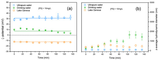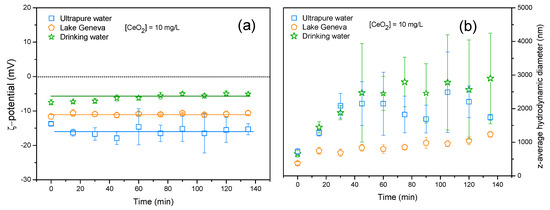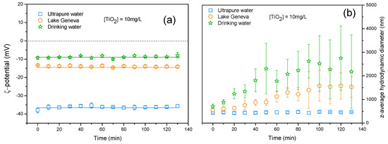(a) ζ potential and (b) z-average hydrodynamic diameter variation of TiO2 as a function of time in ultrapure water at pH = 8.0 ± 0.1, drinking, and Lake Geneva waters at their natural pHs. In comparison to ultrapure water, ζ potential decreases towards less negative values when TiO2 NPs are introduced in drinking and Lake Geneva water, hence promoting aggregation.