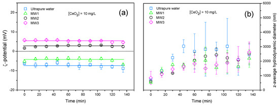 In Figure 6a, are presented the ζ potential and z-average hydrodynamic diameter variation of CeO2 NPs in mineral waters as a function of time. The surface charge of CeO2 NPs in ultrapure water is negative with a ζ potential value that is equal to −7 ± 1 mV. As expected, a decrease in ζ potential value is observed in MWs, which can also be related to water hardness. Indeed, when NPs are added to MW2 and MW3, charge inversion is achieved and surface charge is found to be slightly positive with ζ potential values equal to +2.5 ± 1 mV and +5 ± 1 mV, respectively. Such a behavior indicates strong affinity between the divalent cation and CeO2 negative surface. Aggregation is observed for all water samples with z-average hydrodynamic diameters greater than 1 µm within the experimental time (Figure 6b). The highly variable CeO2 diameters in ultrapure water range from 500 nm to 3000 nm, which is the result of a ζ potential close to zero (−8 mV), and is thus situated in the PZC region.
