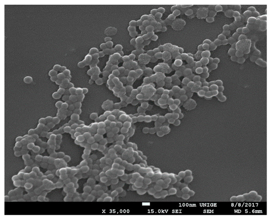 In Lake Geneva water, high concentrations of NOM lead to charge reversal (−13 ± 1 mV), and nanoplastics remain relatively stable with a z-average hydrodynamic diameter of 450 ± 100 nm. This indicates that NOM coating in Lake Geneva is reducing nanoplastic aggregation due to steric stabilization effects. NOM coating is illustrated from a morphological point of view in the SEM image that is presented in Figure 10. PS nanoplastic shapes are no more spherical, butslightly ellipsoidal and fuzzy membranes surrounding the particles are producing less contrasted images.
