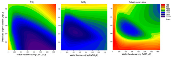 To better highlight the influence of both water hardness and NOM on the aggregation behavior of NPs and nanoplastics, stability diagrams were calculated from the z-average hydrodynamic diameter values that were obtained in the different conditions, and they are presented in Figure 11 for TiO2 and CeO2 NPs, and nanoplastics. All of the results dealing with aggregate formation obtained in MWs, drinking and Lake Geneva waters have merged together. Red color indicates that NPs are dispersed, whereas blue color indicates strong aggregation i.e., the formation of aggregates with sizes that are greater than 2000 nm. For TiO2 NPs, aggregation is found to be promoted by increasing water hardness so long as the DOC concentration is less than 0.6 mg/L. This indicates that divalent ions, such as Ca2+ and Mg2+, are effective in neutralizing TiO2 NPs negative surface charge. As TiO2 NPs are strongly negatively charged at environmental pH, Ca2+ and Mg2+ are strongly adsorbed onto TiO2 due to the attractive electrostatic forces between NPs and divalent cations, resulting in TiO2 NPs charge neutralization. Increasing DOC concentration is found to reduce the aggregation of TiO2 NPs, which is probably due to the formation of Ca2+ and Mg2+ complexes reducing the impact of these ions on the TiO2 surface charge. On the other hand, water hardness is found to have a less significant role on CeO2 NPs aggregation. At environmental pH, the surface charge of CeO2 NPs is close to the PZC (pHpzc = 6.9 ± 0.1) and, consequently, in most conditions, NPs are already aggregated. The stability of CeO2 NPs with regards to water hardness is caused by the repulsive forces between NPs and divalent ions (Ca2+ and Mg2+). DOC increase (above 0.8 mg/L) is also found to reduce aggregation. On the other hand, polystyrene nanoplastics, which are strongly positively charged at environmental pH, are found to be more stable with regards to water hardness and natural organic matter. PS nanoplastics are stabilized against water hardness due to electrostatic repulsive interaction between the amidine functional group and ions Ca2+ and Mg2+. Negatively charged NOM can adsorb onto positively charged NPs promoting aggregation by charge neutralization and via bridging mechanisms that are induced by the presence of divalent cations [33]. However, PS nanoplastics aggregation is observed in a limited domain with specific water hardness and DOC. This is an important issue, indicating that, in general, the polystyrene nanoplastics stability and dispersion state are more pronounced in aquatic systems.