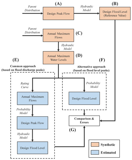 The design flood levels estimated in step E (common approach) and step F (alternative approach) are compared (step G). Errors are defined as differences between these two estimates and the synthetic design flood level estimated in step B is used as a reference value.