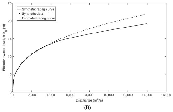 Second, river discharge is almost never directly observed, especially during flood conditions. Measurements of water levels are typically converted into river flows by using analytical functions often referred to as rating curves [13]. Rating curves are often derived by fitting a model to a limited number of direct measurements of river flow (Q) and corresponding water stage (h) [14]. The power law model is commonly used in hydrology to define the relationship between water level and river flow, i.e., the so-called stage-discharge relation [15]. While the uncertainty in the direct measurements of river flows is limited, with expected errors of around 5%, river flow values derived using the rating curve (Q*) are affected by additional sources of uncertainty [7], which can lead to very high errors (over 30%) during high flow conditions [7,16].