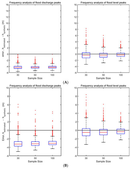 Boxplots of error estimates for the two approaches with Gumbel distribution used for design flood level estimation at cross-sections (A,B). The red lines represent the median (50th percentile), the lower and upper ends of the blue box represent the 25th and 75th percentile, respectively. Outliers are represented by red dots.