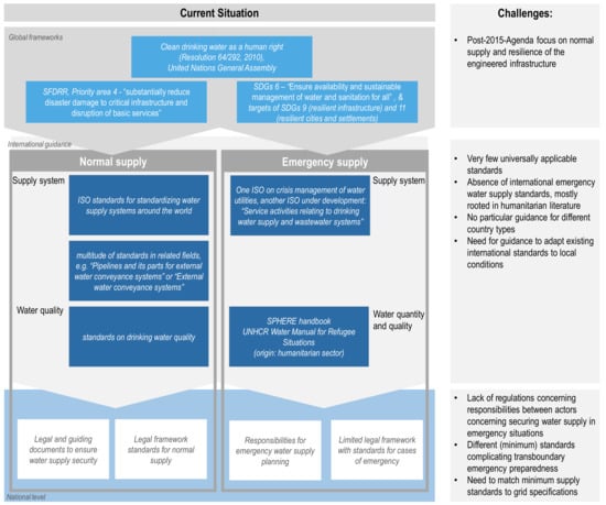 The results of this paper are summarized in Figure 1. Global frameworks show the need for water supply under all conditions as the Post-2015-Agenda focuses both on normal supply and resilience of the engineered infrastructure. Normal and emergency supply are addressed superficially in international and national guidance. However, the emergency water supply standards are mostly rooted in humanitarian literature (e.g., [36,40,41]). An adaptation of standards to local conditions rarely occurs. Consequently, transboundary emergency preparedness is complicated due to different minimum standards in neighboring countries.