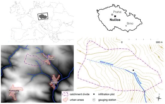 The infiltration experiments were carried out on plots located in the Nučice experimental catchment (Figure 1). This catchment is situated in a moderately hilly area of central Bohemia (Czech Republic), 30 km east of Prague (approximate closing profile position 49°57′49.230″ N, 14°52′13.242″ E). The catchment area is 0.531 km2. More than 95% of the area is arable land, while the remainder includes watercourse, riparian trees and shrubs and paved roads. There are no forests, grasslands or urbanized areas. The Nučice catchment is drained by a narrow stream, which has been piped in the uppermost part []. The average altitude is 401 m a.s.l., the mean land slope is 3.9%, and the climate is humid continental. Based on the records from 1975 to 2015, the average annual precipitation is 630 mm, potential evapotranspiration ranges from 500 to 550 mm [], and mean annual air temperature is 7.9 °C []. Precipitation and temperature data were recorded in 5 min intervals and the distance between the tipping-bucket rain gauge and the infiltration plots was approximately 300 m (Figure 1).