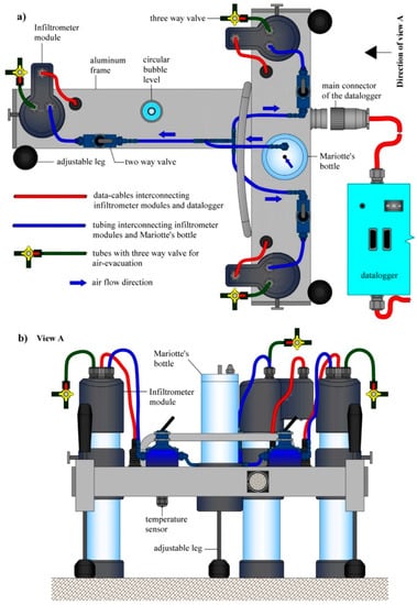 The automated multipoint minidisk tension infiltrometer (MultiDisk) consists of two separable identical aluminous frames and an enclosure containing the datalogger and battery. Each of the two frames is equipped with three infiltrometer modules and a single Mariotte bottle that allows for the application of a constant pressure head during the infiltration experiments. Figure 2 presents the single frame with three infiltration modules in an operational configuration. Bisection of the MultiDisk allows the preparation of each part independently (see Figure 3) at different locations, while another advantage is the possibility of setting different degrees of pressure head for both triplets of infiltrometer modules, ranging from −0.5 cm to −6.0 cm. All MultiDisk’s modules must have perfect hydraulic contact between the porous disc and soil surface. This can be achieved by leveling the frame into a ground plane using three leveling screws. The datalogger is placed in the transport box during the measurement.