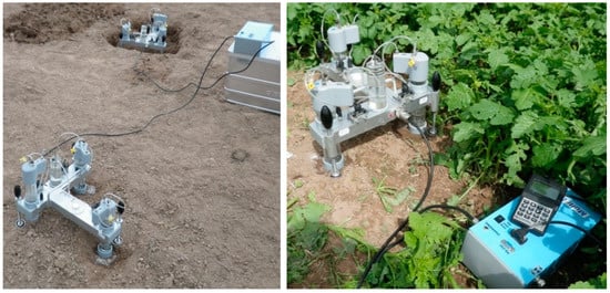 The experiments were performed with the use of a newly developed infiltration device. The automated multipoint minidisk infiltrometer, “MultiDisk”, consists of six infiltrometer modules (see Figure 2) with stainless steel porous disks with a diameter of 4.45 cm and 3 mm thickness. The proposed device is automated using a high precision load cell with a mounted vertical bar which is immersed in water in the reservoir tube (with a maximum storage volume of 175 cm3). The volume of infiltrated water is measured via changes of buoyant force acting on the vertical bar []. The output signal of the load cell is recalculated to the actual cumulative infiltration; cumulative infiltration data are directly fitted using the Philip equation [], and unsaturated hydraulic conductivity is evaluated using the modified Zhang method [,].