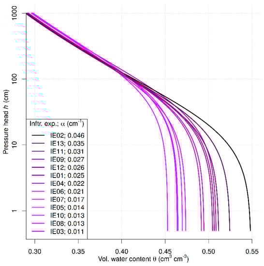 Soil samples were taken after each infiltration experiment. Experiment-specific retention curves resulted from the fitting of resampled points to the reference retention curve across the range of pressure heads (−100 cm to −10,000 cm) and the measured saturated water content. The only optimized retention parameter was van Genuchten’s empirical parameter α (cm−1). Residual water content and empirical van Genuchten’s parameter n, often associated with the pore size distribution (e.g., []) rather than changes in macroporosity, exhibited very low sensitivity to the θs variability and therefore remained fixed. Thus, experiment-specific retention curves were obtained for each infiltration experiment. For presentation, in Figure 4 the soil matrix parameters are scaled using scaling factors of pressure head and water content []. Scaling factors allow each of the experiment-specific retention curves to be characterized by a unique set of scaling factors representing a single measurement campaign (IE1 to IE13, see Table 1).