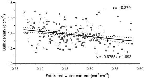 The dataset from the long-term topsoil physical characteristics monitoring shows large variability (Figure 5) with statistically significant dependence of bulk density on saturated water content, as the zero-slope hypothesis was rejected at the α = 0.05 level of significance (p < 0.0001). In general, the saturated water content of the topsoil decreased with the increasing bulk density (as a result of the topsoil consolidation).
