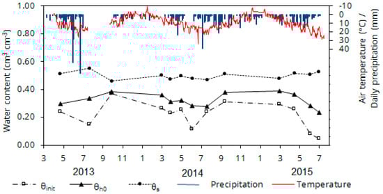 Note the low water content and high air temperatures in July 2015, when the last infiltration experiments were performed. The summer of 2015 was characterized by exceptionally high temperatures and below average precipitation in Central Europe [].