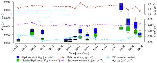 Observed unsaturated hydraulic conductivity (Kh0) during three growing seasons shows high temporal variability (Figure 7). The difference between the blue (Kh0 calculated without retention curve scaling) and the green box-plots (Kh0 calculated with retention curve scaling) varies for each infiltration experiment.