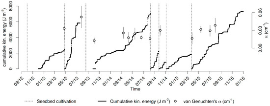 Seasonal variability of the van Genuchten’s parameter α related to cumulative rainfall kinetic energy. Seedbed cultivation (dashed line) is assumed to interrupt the effect of the previous rainfall.