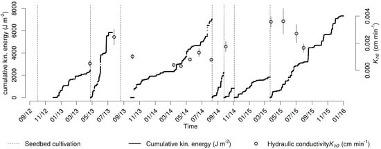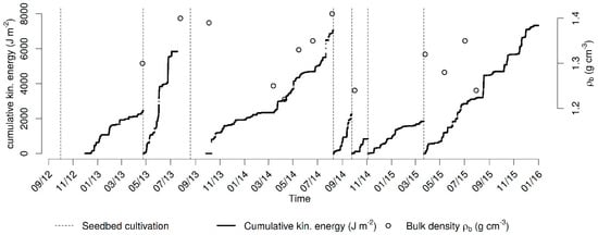 Bulk density was positively correlated with the cumulative KE (Figure 11C), with the only exception in 2013 where the data points corresponding to the lowest cumulative kinetic energy exhibited larger values. An increasing trend corresponds with the idea of gradual compaction between consecutive seedbed cultivations due to a complex set of factors including the impact of the rainfall. In Figure 11D, the trend between saturated water content and the corresponding cumulative KE is negative. A gradual increase of the topsoil saturated water content during the growing season is visible in all the years up to the cumulative kinetic energy of 3000 J m−2, then the θs decreases. For our interpretation of the results, the changes in the saturated water content serve as a proxy for macroporosity.
