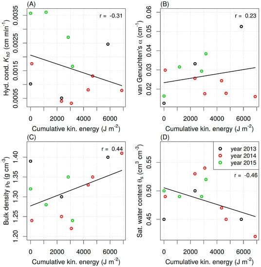 Linear regressions between cumulative kinetic energy KE, unsaturated hydraulic conductivity Kh0, van Genuchten’s parameter α and bulk density ρb are shown in Figure 11. Hydraulic conductivity exhibited a negative correlation with the corresponding cumulative KE as shown in Figure 11A. In 2015, the negative trend was stronger compared to the overall trend as depicted by the trend line and the value of the correlation coefficient. In Figure 11B, the relationship between parameter α and the corresponding cumulative KE is shown, and the trend line exhibited a weak positive correlation. The trend, however, differs among the years. Although the data show an increase of α with cumulative KE in 2013 and 2015, the trend in 2014 is the opposite. It has to be noted that α and hydraulic conductivity Kh0 are not independent variables, as α is used to derive Kh0.