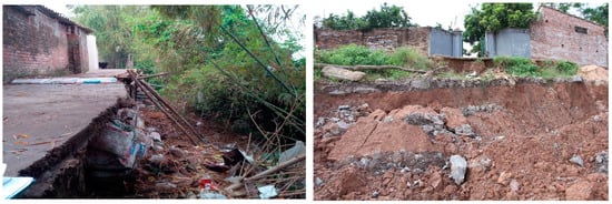 The selected riverbanks are almost natural banks, and some are supported in the toe by vegetation. The riverbanks in these locations have either collapsed or have high failure potential due to fluctuations in the river water level, river water flow stress, rainfall, and human activities. Figure 1 shows the road near the riverbank (left), and the natural riverbank (right), which was broken in the rainy season of 2016 and 2017.