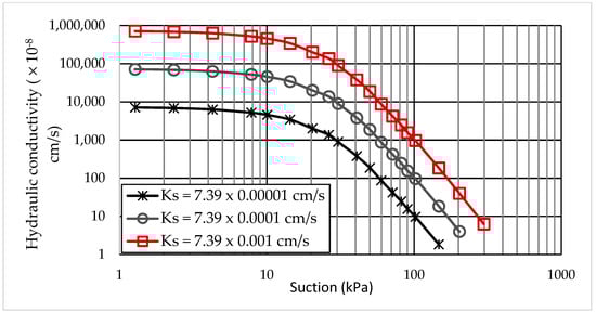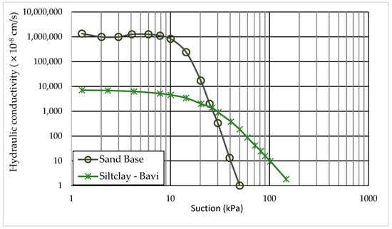 The soil properties included soil physical properties such as water content, density, and grain size. The saturated hydraulic conductivity and shear strength were obtained in the geotechnical laboratory of VNU University of Science, Vietnam National University, Hanoi. The unsaturated soil properties, such as soil suction, were determined by using a pressure plate apparatus in the geotechnical laboratory of Ibaraki University, Japan, as shown in []. Based on the soil samples collected along the riverbank in the Hanoi area and the soil properties experiment, the riverbank in this area is quite homogeneous, with a silt or silty-clay layer in the bank layer and fine sand from the toe of the riverbank to the sediments. The silt layer is composed of less than 20% fine sand, 30–70% silt, and 10–30% clay. This paper selects one section of the soil bank to analyze riverbank stability, as shown in Table 1. Figure 2 and Figure 3 present the suction and unsaturated hydraulic conductivity, respectively. The unsaturated shear strength and hydraulic conductivity were estimated by using the models of Vanapalli (1996) [] and Van Genuchten (1980) [] in the GeoSlope program [,].