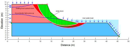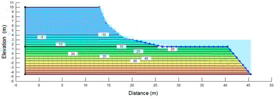 The boundary conditions of river water level (RWL) and rainfall intensity were set up in the SEEP/W model. Using the riverbank configuration shown in Figure 4, the initial RWL was the boundary in the river site from the bottom to 3 m, and the function RWL–time was the boundary of the entire lateral riverbank. The rainfall was the boundary on the surface of the riverbank. Both scenarios with and without the function “potential seepage face review” were used with the rainfall boundary. Without the function “potential seepage face review”, the rainwater would infiltrate into the soil as long as the rainwater exceeded the infiltration capacity; under these conditions, a pond would present above the riverbank surface when there was excess rainwater. This condition often occurs at some riverbank sites that have a pond or low areas near the riverbank and during floods. If the “potential seepage face review” was included, the pond would not exist, and the excess rainwater would run off.