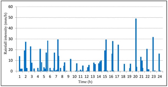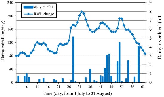 The rainfall intensity was determined based on daily monitoring data. The rainy season is from mid-June to mid-September, and high rainfall often occurs in August. Figure 5 shows the variation in the rainfall intensities (RI, mm/h) of several rainy days in the rainy month (August 2016), and Figure 6 shows the changes in daily rainfall and RWL monitored during the rainy season from 1 July to 31 August where some sites in the Red River bank broke. It can be seen that the rainfall intensity ranged from 0–50 mm/h. To simulate the effect of rainfall intensity on riverbank stability, three rainfall intensities were used: RI = 10 mm/h; RI = 30 mm/h; and RI = 50 mm/h. Based on the RWL data, the initial RWL was set as 3 m.