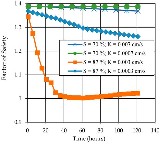 Figure 9 shows the results of FOS versus time with the saturation degrees of 70% and 87% and RI = 10 mm/h. These were cases H-1-1, H-2-1, M-1-1, and M-2-1. In these cases, the rainfall intensity was lower than the hydraulic conductivity when the saturation degree was 87%, and the rainfall intensity was slightly higher than the hydraulic conductivity when the saturation degree was 70%. Most of the rainfall water infiltrated into the soil and caused the increase of pore-water pressure by the raising of the groundwater table. The FOS results indicated the effect of the saturation condition and hydraulic conduction on riverbank stability. The higher saturation condition and higher hydraulic conductivity caused higher pore pressure; then, FOS decreased more quickly and obtained a lower value (Figure 9).