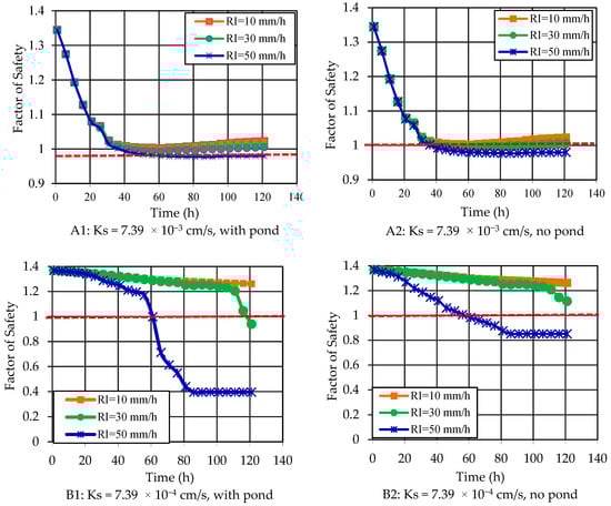 For Ks = 7.39 × 10−4 cm/s, the range of FOS in cases with a pond was from 1.36 to 0.39 (Figure 10B1), and from 1.39 to 1.03 in cases with no pond (Figure 10B2). In both cases, the FOS change was insignificant with an RI of 10 mm/h; however, the FOS decreased rapidly after 55 h and 110 h where RI = 50 mm/h and RI = 30 mm/h, respectively. In the case with a pond, the riverbank failure occurred at 60 h and 115 h with RI = 50 mm/h and RI = 30 mm/h, respectively. In the case with no pond, riverbank failure only occurred when RI = 50 mm/h.